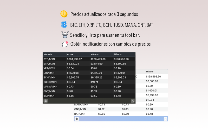 · Mostrar en el toolbar cualquiera de las monedas soportadas en su último precio, ejemplo si decides Bitcoin, en tu toolbar se mostrará el último precio de dicha moneda.