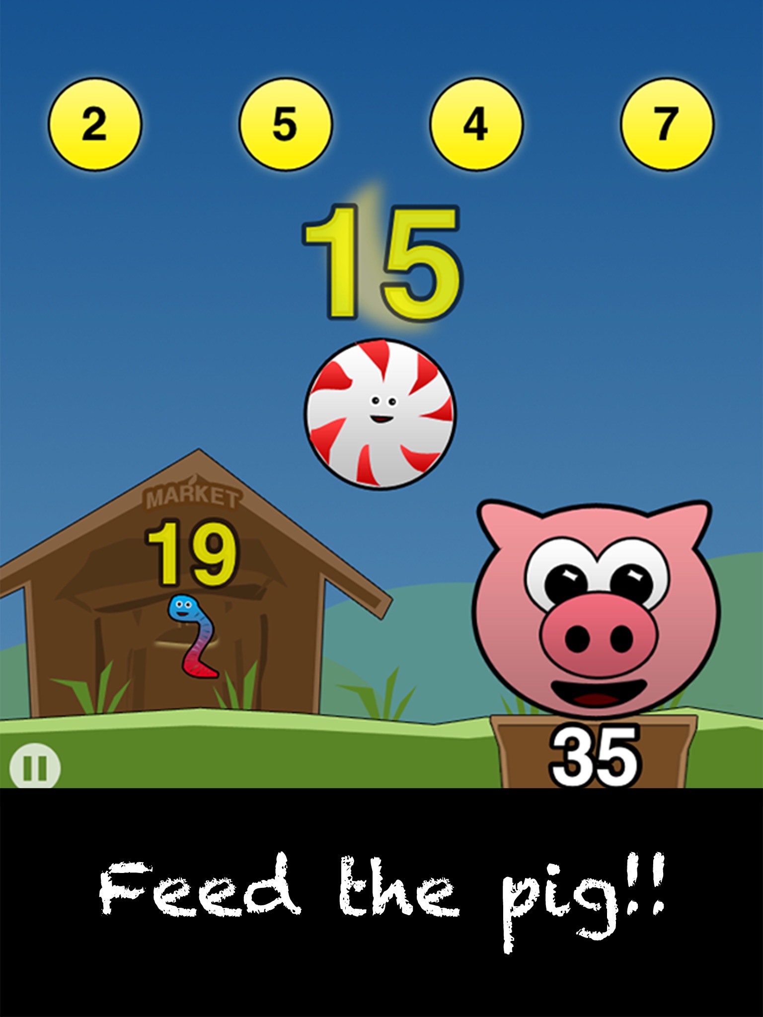 Choose a pig and pick a meal. Then add up your coins to buy food from the market and watch your pig grow. You have from sunrise until the moon goes down to feed your pig and earn your ribbon. Use as many coins as possible to make each number and score bigger! Make your BIG PIG BONUS count!