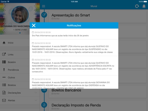 Avisos, ocorrências escolares, declaração de pagamentos, enfim....
