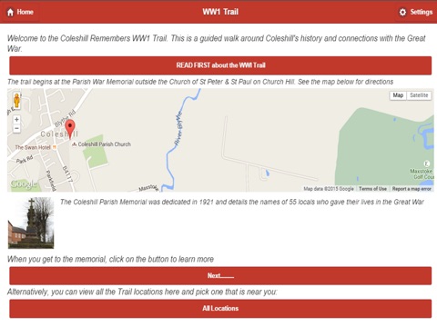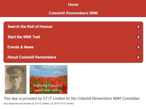The Coleshill Remembers WWI App will help you learn about the Great War History of the town of Coleshill, Warwickshire. The App includes the Roll of Honour with 140 of Coleshills Casualties, news about WWI Commemoration Events, the Coleshill WWI Trail around the places that were important during the war and a way to keep in touch with all the WWI Casualty Vigils taking place in the town during the centenary years.
