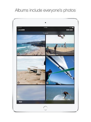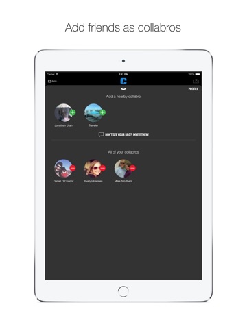 Just add nearby friends as "collabros" and take photos together. Everyones content will automatically be combined into collaborative albums. You can then share an entire album or just your favorite photos.