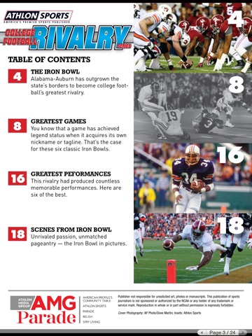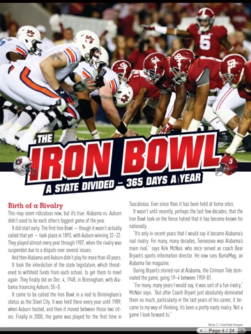 Rivalries capture the passion and pageantry of college football like nothing else. Athlon Sports taps into that passion with our College Football Rivalry Series, starting with the game that consumes an entire state 365 days a year — the Iron Bowl, Alabama vs. Auburn. Athlon examines the origins of the rivalry and takes an in-depth look at many of the greatest games and performances in the storied history of this epic feud, from "Punt Bama Punt" to the "Kick-Six." We also tap into our photo archives to bring you scenes from the Iron Bowl, featuring such legendary figures from the rivalrys history as Bear Bryant and Bo Jackson. Future entries in the Rivalry Series will focus on such classic rivalries as Ohio State-Michigan, USC-Notre Dame, Army-Navy and Oklahoma-Texas.
