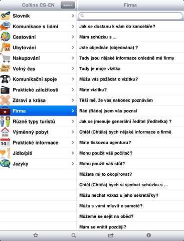 This is probably the best app I have purchased. I use it to learn words my boyfriend and his family uses (theyre Czech and his family barely knows English). I have learned many basic phrases and the pronunciation of the many accented letters and such. The one thing I wish the app had is a direct English > Czech and visversa translation. It is great for any traveler and/or businessperson venturing to the Czech Republic!