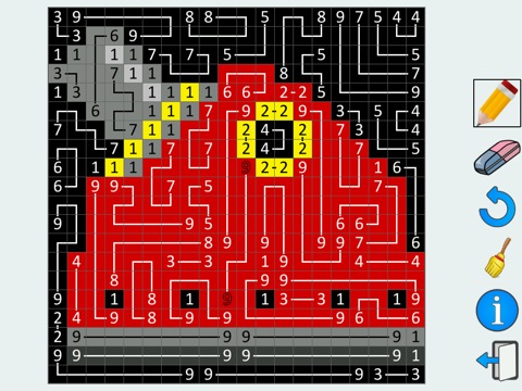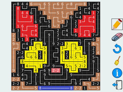 Color Philippine Puzzle (also known as Link-a-Pix, Pathpix, Paint by pairs, Paint by numbers, Pict-Link, Picross, Number Net, Piclink, Link Puzzle, Puzzle Grid, Logic Grid, Puzzle Cross, Square Puzzle) is a special type of puzzle that relies on logic in order to reveal a certain picture. Puzzle look like a grid with numbers scattered in various places. All numbers, except the 1s, have pairs. For every number except 1 it is necessary to find same-number pair and join them together with a path of the corresponding length.