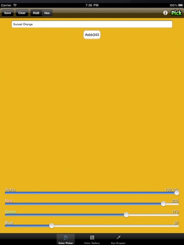 View colors in hex (web), RGB, or CMYK formats. Colors can be modified in either RGB or hex formats. Every photo you snap in the application is saved to your camera roll so you can easily come back to it later.