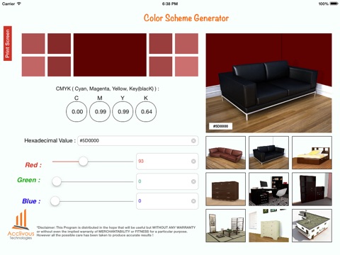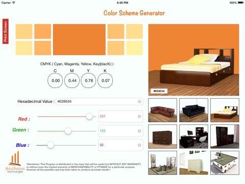 CMYK (Cyan, Magenta, Yellow, Key(blacK)) and Hex codes. An user can easily generate color shade whose effect can be visualized on Walls and furnishings available in the Apps library.