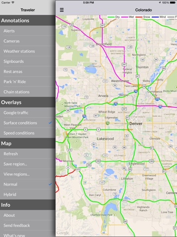 Colorado Traveler shows you the current status of major roads and highways throughout the entire state. By accessing Colorado Department of Transportation extensive road data, you can view traffic cameras, read alerts about construction and other road-related issues, get stats from weather stations, and read roadside signboard messages. We dont stop just with CDOT data; we also include cameras from Fort Collins and Colorado Springs. You can view road overlays that tell you weather-related driving conditions. You can read all those historical markers without getting out of your car! Also available is Google Traffic, just so you have all the data in one app.