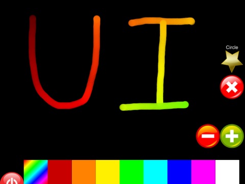 Choose different colors or rainbow. Draw slower for solid lines. Clear the screen with the red and white X button. The plus and minus buttons change the size of the drawing shape.