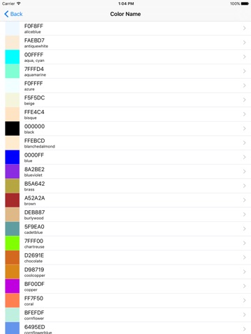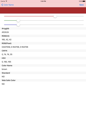 - HTMLカラーコード、カラーネーム、RGB(Int)、RGB(Float)、CMYK、HSL、HSVを確認することができます。
