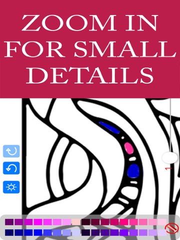 It’s easy to get started with this grown up app, that by the way costs less than a coloring book. The instructions explain everything step-by-step. You can save, zoom in and out, erase, undo and redo, start over, share your artwork, and choose from a huge selection of color palettes. Now you can experiment with colours and patterns all you want. Here are all the great features: