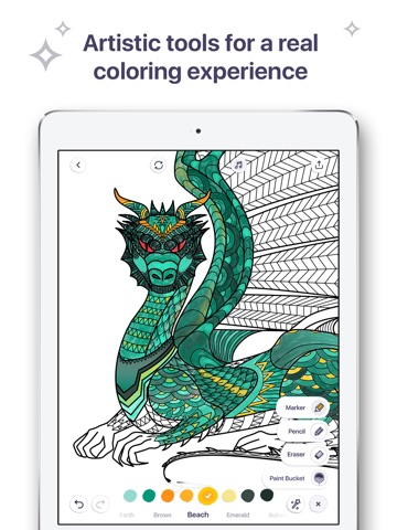 - Various coloring tools: color in a simple way with the tap-to-color tool or have real coloring experience using markers and pencils