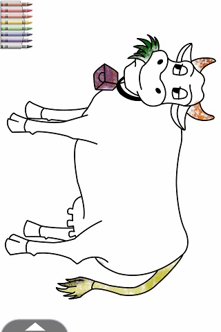 * Pick a cow: Tap the arrow on the bottom right of the screen to activate the options bar. Then tap the cow button, spin the cow carrousel, and select the cow you want to color
