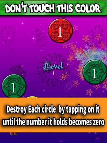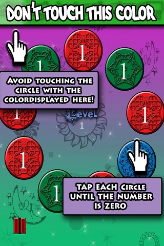 Take control over your urges to tap the screen and you might be able to play this game! The turning wheels keep changing their color .. the banner on the top will tell you what color you can’t touch at each moment .. You need to tap on each circle until the number inside it is zero and it will evaporate! the catch is you can’t tap on the circle that has the forbidden color which is displayed on the top banner.
