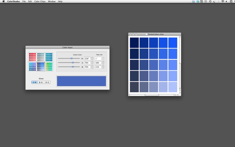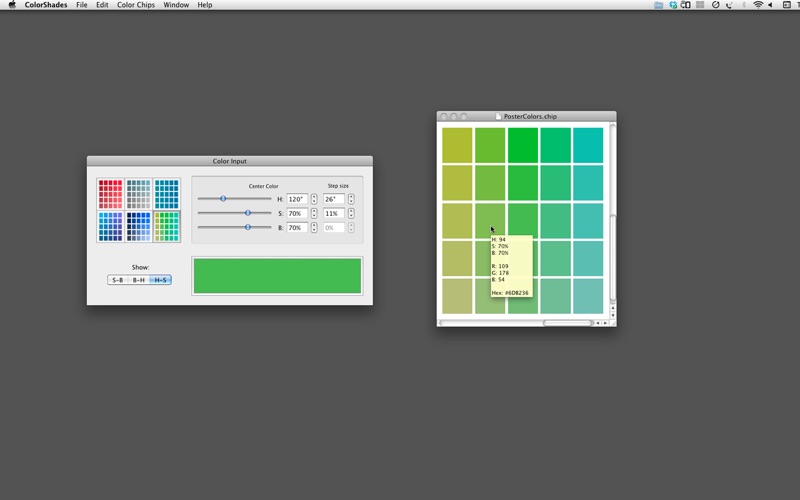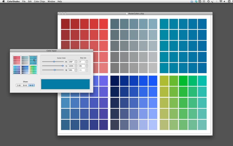 ColorShades is designed to help you choose colors by looking at grids of related colors. You set the center color of a grid using the intuitive Hue-Saturation-Brightness model. You then pick which two out of Hue, Saturation, and Brightness that you want to vary across the grid, set the step sizes and ColorShades fills in the grid.