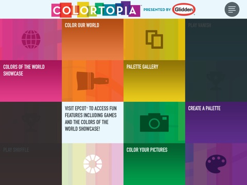 Explore the world of color with a palette of features that allow you to play with color at home and at the Colortopia exhibit in Epcot®. Create your own palettes and use them to color murals and your personal photos. Use 11 unique palettes based on the nations of World Showcase at Epcot® to give photos of your own home an international flair. There are even two colorful games for Colortopia exhibit guests to play.