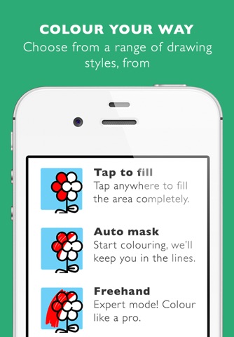 - Three drawing styles. Choose to tap to fill an entire area, or use our unique auto masking mode to easily keep within the lines. Freehand mode allows you to express your creativity without limits!