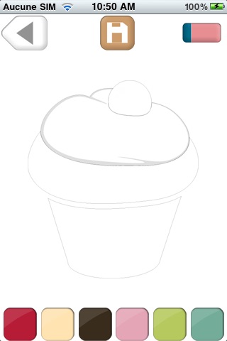 L’interface du jeu de coloriage présente le dessin choisi par l’enfant, une palette de couleurs, une gomme pour parfaire le résultat et une icône de sauvegarde qui donne la possibilité de garder les œuvres sur l’iPhone.