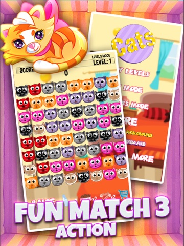 Cats is a fun to play match 3 type game. There are multiple levels in Cats and lots of fun options to customize gameplay. Play and match quickly and avoid the Crazy cat as he causes mischief and can block your movement. If you enjoy crushing candy then you will certainly enjoy playing Cats. Fun for the whole family
