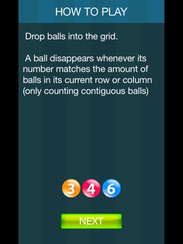 Drop the numbered balls into the grid, trying to remove the ball as much as possible. One remove may cause the others(COMBO), the COMBO will always come nomatter you intend or not, let you fully enjoy it.