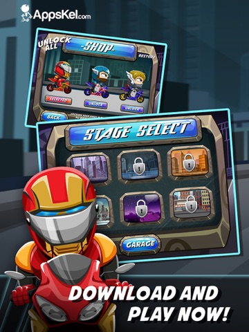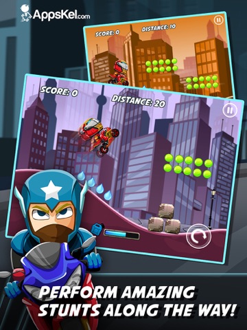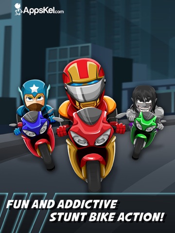Get ready for the ultimate stunt bike racing challenge. Play all 10 different Super hero bikers in multiple scenic locations.