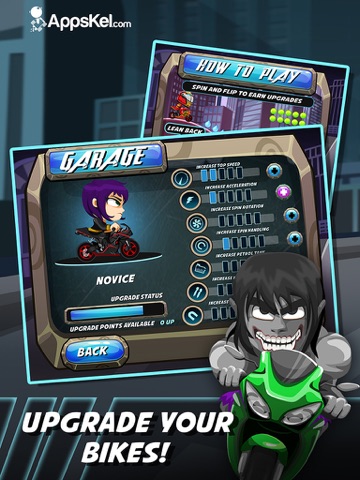 Hit the gas and perform front flips and backflips to earn more upgrade points you can use to customize your biker.
