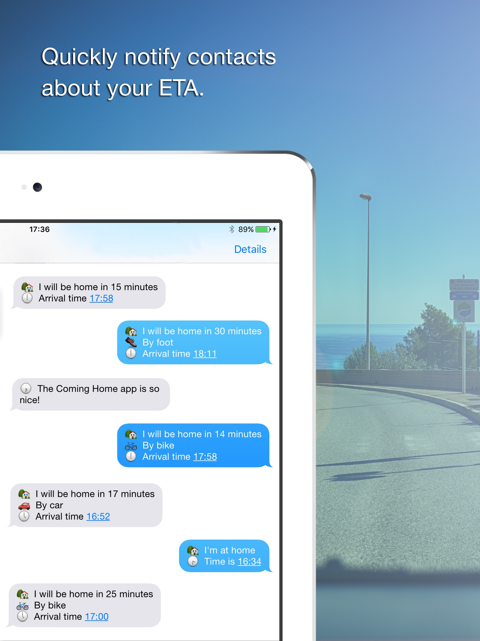 Just select your transportation type and the app calculates how long it will take you to get home. With just one tap you can send your arrival time in a clear message.