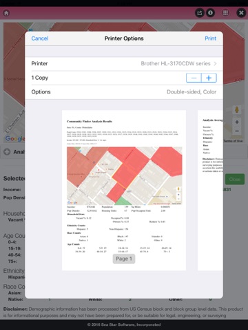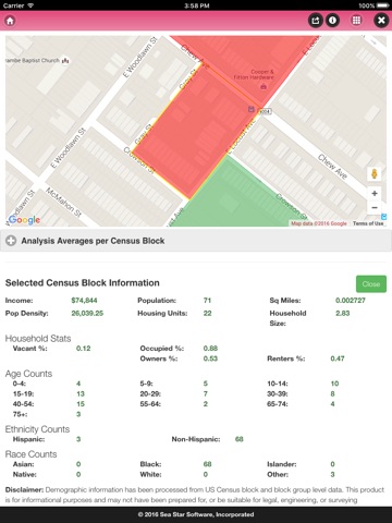 Results are displayed by census block in both map and tabular format. You may tap a block from the map or table to view detailed population information that includes: