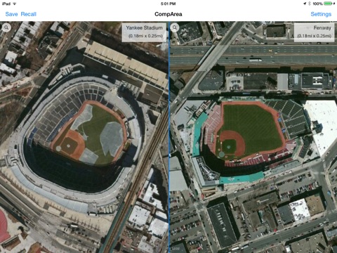 You can select the location for each map by tapping its search icon (the magnifying glass), and typing the name of your location of interest (or something nearby). Zooming in or out on one map automatically adjusts the zoom of the other to maintain identical scales; the maps can be panned independently to adjust the positions being compared.