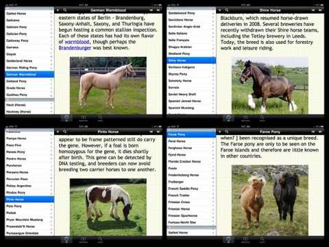 The Complete Horse & Pony Bible is an application containing detailed information of over 300 species of horses & ponies. It is probably the most complete and comprehensive horse breed encyclopedia available in the App Store. This App is an excellent app for people who love horses or horse-back riding and for those who are interested in racetrack handicapping. For each type of horses, the following information is included for easier reference: