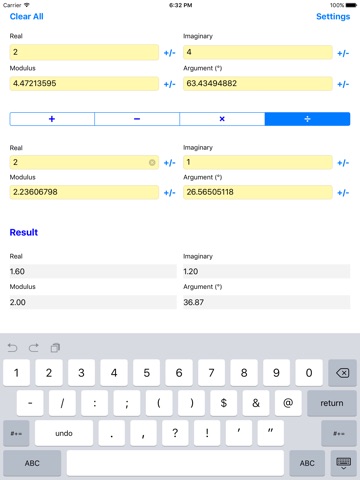 Complex Number Cruncher calculates the sum, difference, product or quotient of two complex numbers. Enter the real and the imaginary, or the modulus and the argument value for each complex number, select +, -, × or ÷ and the result will be calculated automatically.