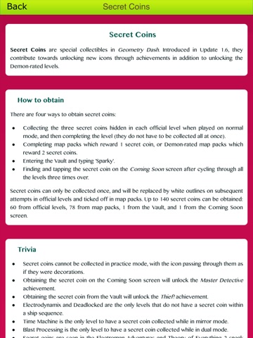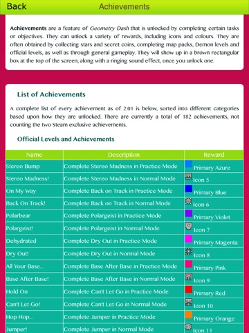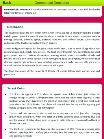 This Comprehensive level Guide for Geometry Dash will give you information & tips that will keep your fingers and feet moving..Jump and fly your way through danger in this rhythm-based action platformer! "