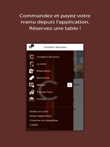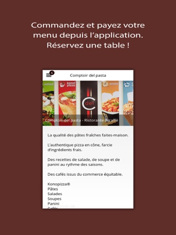 Lapplication Comptoir del pasta vous permet de consulter notre carte depuis votre smartphone ou tablette, de commander et payer votre menu et de réserver une table.