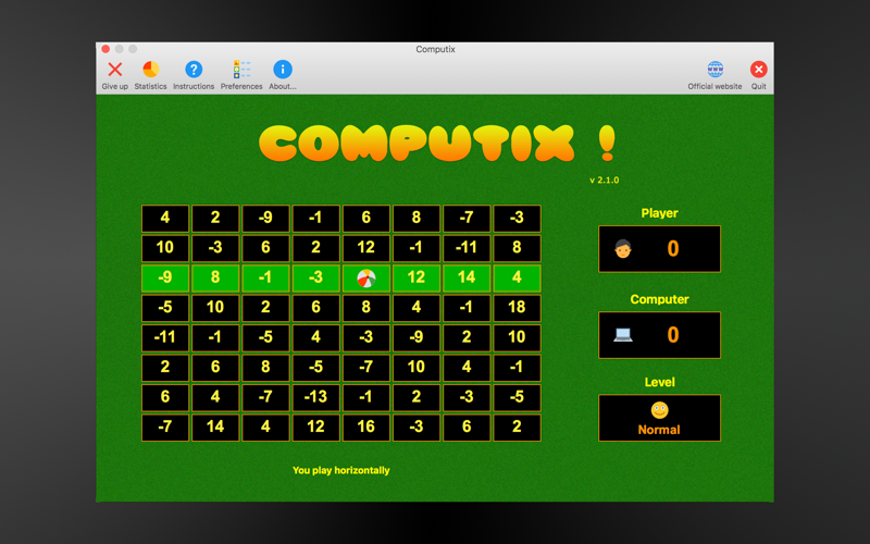 At the beginning, the 64 values are placed randomly on the board. You play horizontally, the computer plays vertically. The cursor is symbolized by a red circle.