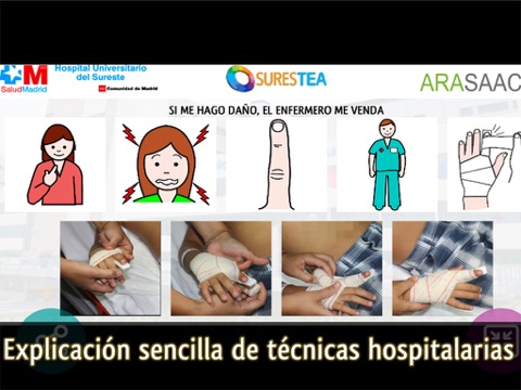 Proyecto de adaptación visual del Hospital Universitario del Sureste, para mejorar la comunicación de los profesionales sanitarios con niños con Trastornos del Espectro Autista, mediante láminas de pictogramas diseñadas por la asociación SURESTEA, con los pictogramas de ARASAAC, para explicar sencillamente las técnicas hospitalarias a las que se van a enfrentar los pacientes pediátricos con esos transtornos.