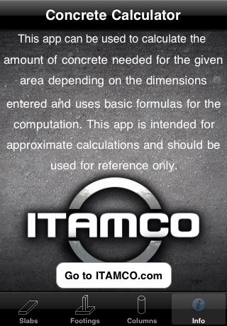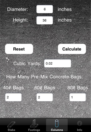 Concrete Calc Mobile is a simple app for calculating the volume of concrete needed of various shapes. Intended for reference use only.