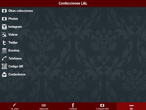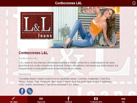 L&L Jeans, Página web, Facebook, 1 Colección 2015, Otras colecciones, Photos, Instagram, Videos, Twitter, Eventos, Telefonos, Codigo QR, Contactenos