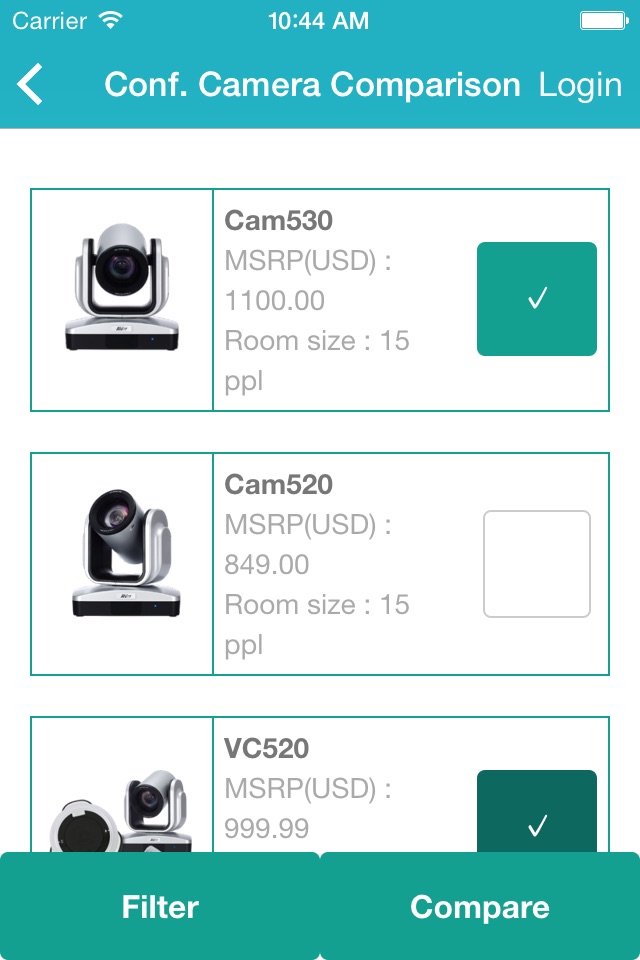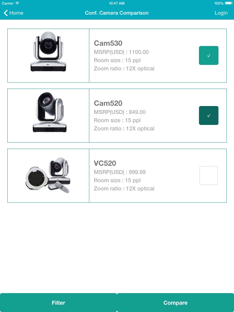 The AVer Comparison App helps you compare a variety of different conference cameras. Cameras are compared on tables that can be saved as PDF files or shared via email. The app can be used while either on or offline. If you are an AVer employee you can log in using your employee number.