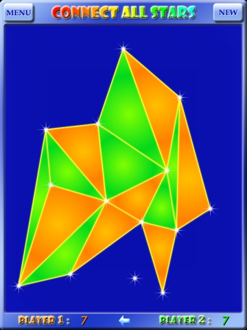 "Connect All Stars" is a simple and very addictive game. The two players, orange and green, alternately connect stars on the board. If the player connects any two stars and makes the new triangle(s) then the player gets the point(s) and new triangles are colored with player’s color. The goal of the game is to collect more star triangles than your opponent. Develop your own strategy and try to win!