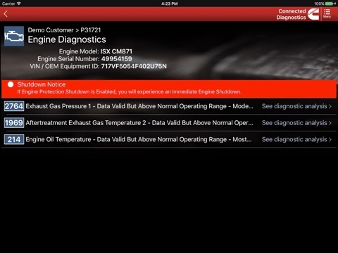Connected Diagnostics™ uses the power of Cummins to analyze the fault code data, prioritizing all active and recently inactive faults to provide a high level of confidence that the recommendation to stop immediately or service immediately is the right one. Suggesting probable root cause of the fault to the component level, Connected Diagnostics™ facilitates the repair and minimizes downtime.