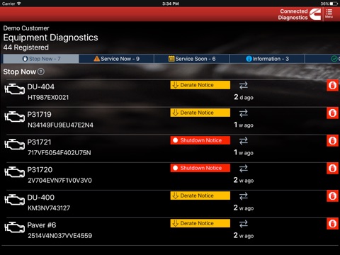 • A tabulated listing of your equipment by current fault code status with a quick count reference on each tab.