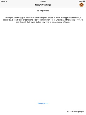 Every morning, everyone gets the same new challenge for the day. If you accept the challenge, you then try your best throughout the day to incorporate it in your experience. In the evening, you mark the challenge as finished and add a daily journal entry to keep track of your progress and share your insights with the others.