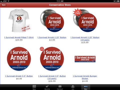 Shop in our Conservative Republicans of CA store. Here youll find buttons, bumper stickers, t-shirts and more - including our exclusive "I Survived Arnold" shirts and stickers.