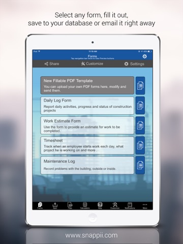 • Retrieve PDF forms of estimates, timesheets, maintenance logs and daily reports and share them via email, Facebook, network drives and other sharing options available on device