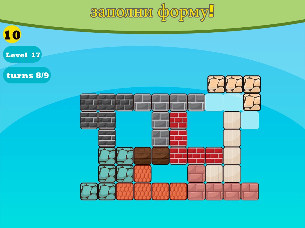 The goal is to drag and fit the color blocks to cover the whole board with the minimal moves. A level will be completed if all blocks have been used and theres no more free space in the board.