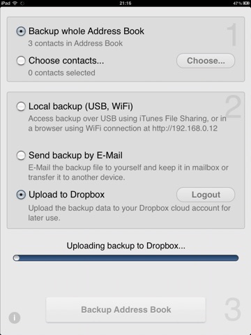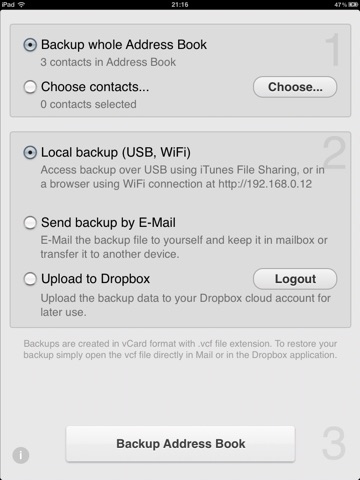 Sieht schick aus, funktioniert aber nicht mal ein bisschen. Beim Verschicken von vcard files per Email fehlt die Datei. Über dropbox oder itunes wird zwar eine vcard Datei erstellt, aber diese ist 0 byte groß und lässt sich nicht öffnen. Finger weg!