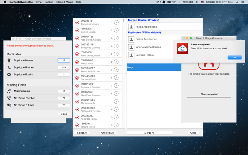 *Features Remove duplicate contacts that allow you to merge duplicate contacts in Mac address book to one single contact before synchronization