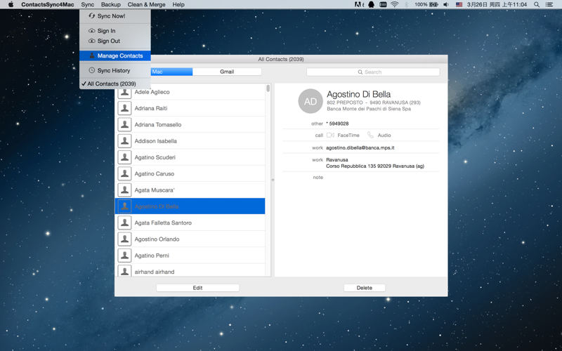 “Contacts Sync” makes you synchronize Gmail & Mac contacts information quickly and easily, and then you can conveniently visit your contacts information at anywhere. This application was carefully designed, most operations are “A key to finish”, thus can dramatically improve work efficiency, especially the “Smart Sync” technology can automatically recognize same name as the contacts in Gmail & Mac and make smart merge, and guarantees must not generate repeat contacts information or any spam.