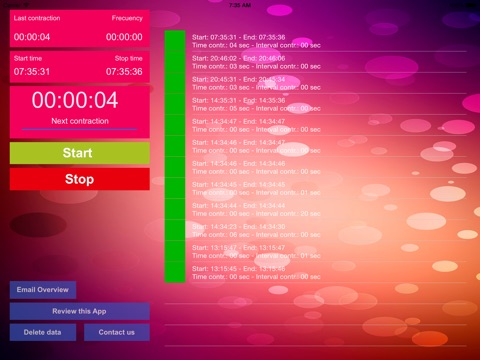 The only reason I purchased this is so that I could export the data. You can imagine how angry I was when I pressed export data and NOTHING WAS THERE. In addition the spelling and grammar throughout the application is beyond atrocious. This looks like it was thrown together by an 8th grader in computer programming class in some third world country. This is the first review I have written in a long time. That is how unbelievably upset I am about this. The screen shuts off while timing and does not respond on the first tap after unlocking the phone so your measurements are off. There is no averages. Only records your last time between contractions and their duration. You can look through the list but it doesnt do something as simple as a average. Extremely dissatisfied.