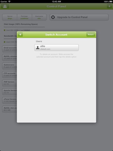 Control Panel Lite is a free application which allows you to view the bandwidth and current disk space of your account. Control Panel Lite is designed to work cPanel®.