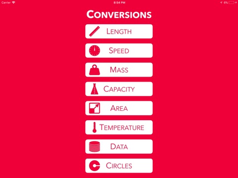 Conversions now converts Length, Speed, Mass, Capacity, Area, Temperature, Data and Circles!